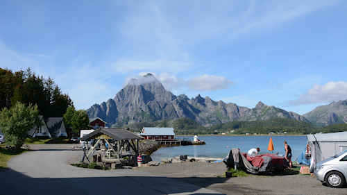 Kolejnego dnia po dojechaniu do skrzyżowania z E6 skręcamy w prawo: [ skrzyżowanie] w stronę Bjerkvik i trzymając się E10 wkraczamy na Lofoty kierując się w stronę Kabelvag, to nasza baza. Wybór jest uzasadniony położeniem (mniej więcej na środku Lofotów), bliskością Svolvær, ceną kempingu oraz jego usytuowaniem nad oceanem. Aby nie pomylić kempingu (są w Kabelvag min trzy) należy minąć Kabelvag i po około jednym, dwóch kilometrach zjechać w lewo: [ zjazd], następnie wąską drogą asfaltową do rozwidlenia widocznego na linku: [ rozwidlenie ] i odbić w lewo, lekko pod górę przy widocznej po prawej innej recepcji. Trzymając się asfaltu dojedziemy do recepcji Sandvika Camping.